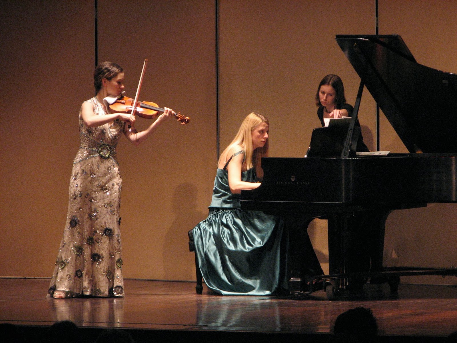Generally I figure out where to stand in relationship to the piano seconds before I actually perform. I want to be able to see the pianist’s fingers out of the corner of my eye and I want to be sure the pianist can see my scroll and bow so that I can lead entrances. But a little premeditation can go a long way! As I prepare for a group class on performance I decided to do a little research. Thankfully the interweb has thousands of images of violinists in recital mode. Here are a few images which offer advice from the pros as to where to stand. Typically the violinist stands right next to or just behind where the pianist sits. It is hard to position oneself so the audience can still see the pianist, but the site line of the violinist to the pianist and vice versa is unobstructed.